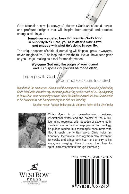 Chris’s debut book, The Power of Journaling, inspires readers to observe and celebrate their lives with his own travel stories and personal anecdotes from his thirty-five years of journaling. He introduces readers to ARISE, a four-step method that invites deeper intimacy with God through reflective writing. Chris draws from his own healing journey, rich devotional practice, and ministry experience leading workshops in churches, online, and independent living communities.
